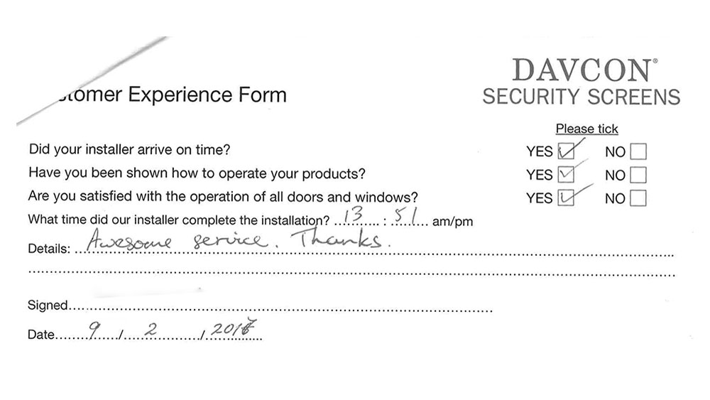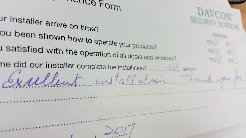 “I chose your company to supply and install some Crimsafe security screens for me in February. I had previously used Davcon back in 1997 for fly screens. I wanted to let you know that my wife and I are extremely happy with the whole process; quote, follow up calls, check measure, install. We both feel safer in our home and have peace of mind that we have the best screen available. They weren’t as expensive as I thought they might be. All your staff were efficient and professional.”