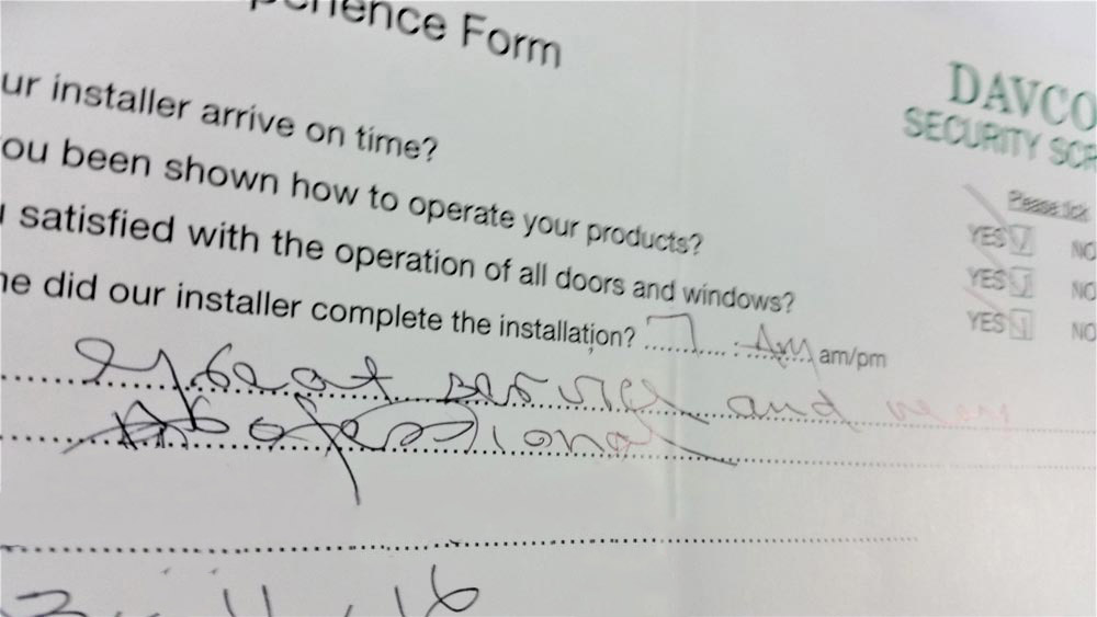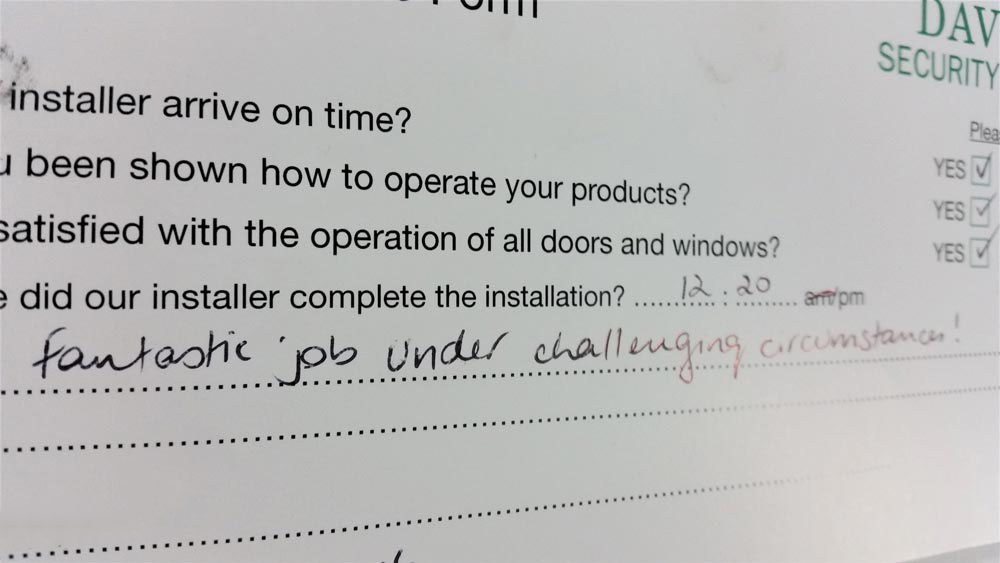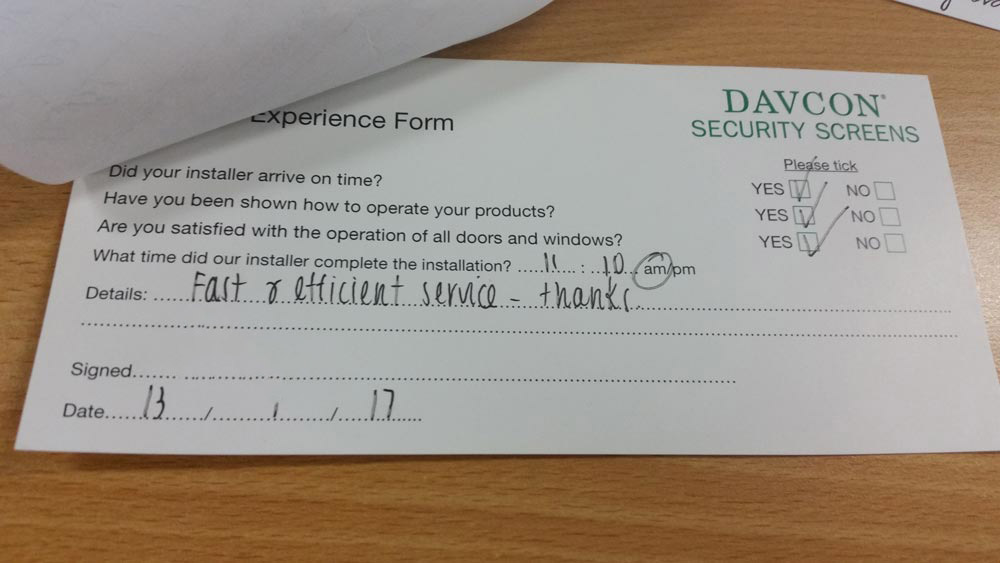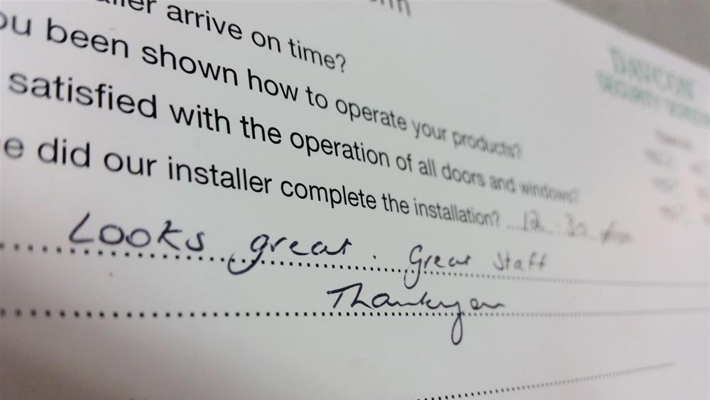 “We were most impressed by your installer, Jason, who made a few adjustments to our existing Davcon/Crimsafe fittings before doing the new installation, to our entire satisfaction. We found him pleasant to deal with and most professional in the performance of his work.