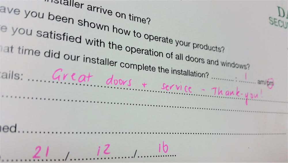 “Your service is excellent and we are getting to know and love our new door. It certainly makes me feel safer.