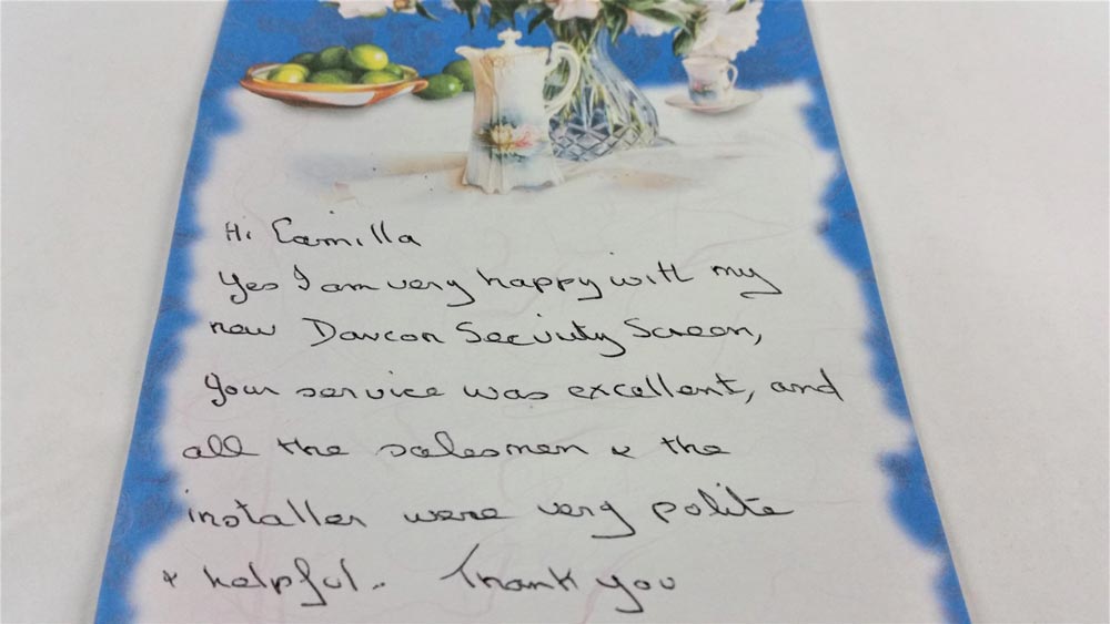 “After obtaining two other quotes, yours was the cheapest by far. But we are mainly writing to you to express our appreciation of the installation carried out by the sales representative and the installer. It was a difficult job owing to the age of the house but all problems were overcome in a professional manner. Special mention must be made to the installer who had to return this week to finish off. He could not have been more explanatory and helpful. Should further visitors enquire about screens, we shall have no hesitation in recommending Davcon.”